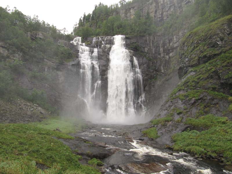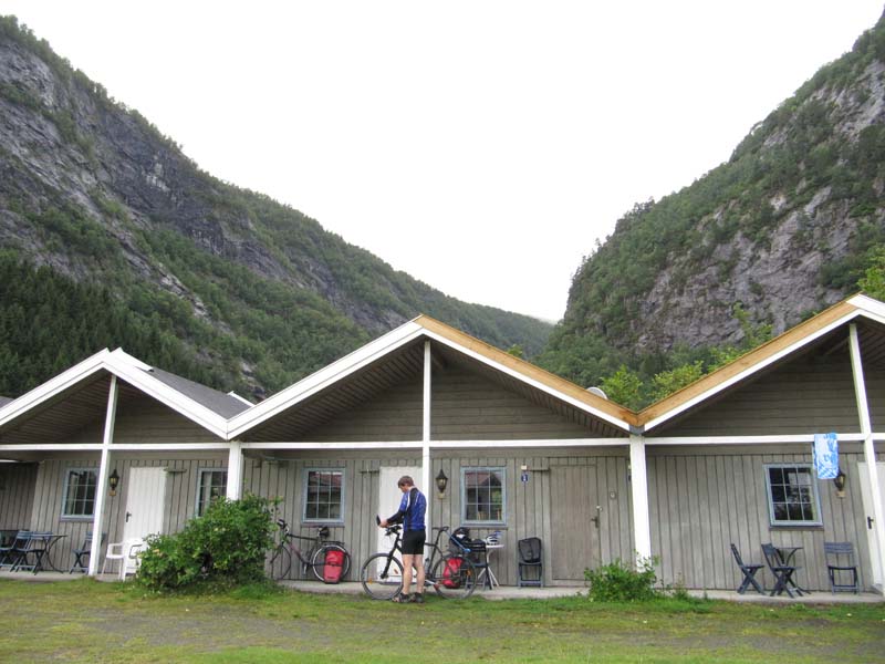 und Granvin. Glücklicherweise mussten wir zwischenzeitlich die E13 verlassen (Tunnel) um die Abfahrt auf einer einsamen Strecke an einem beeindruckenden Wasserfall vorbei genießen zu können. Weiter gings über die 7 am Havangerfjord. Viele Übernachtungsmöglichkeiten gibt’s dort nicht, so dass wir uns in Kvanndal auf dem Campingplatz einmieteten. 290,-NK + 50,-NK für Einweg-Bettwäsche pP. Abends die letzten Sandwiches aus der Theke gesichert, um morgens Frühstück zu haben. Die Pommesbude öffnet erst um 9:00. -110km-