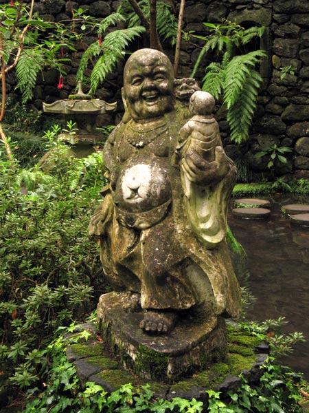 Der Garten ist asiatisch aufgemacht und bietet auch ein wenig Kunst. Skulpturen zieren die Wege. Hat man